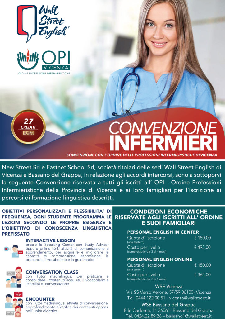 Grazie all’accordo tra Wall Street English e l’Ordine delle Professioni Infermieristiche della Provincia di Vicenza (OPI Vicenza), tutti gli iscritti e i loro familiari possono usufruire di una convenzione speciale per l’iscrizione ai percorsi di formazione linguistica.